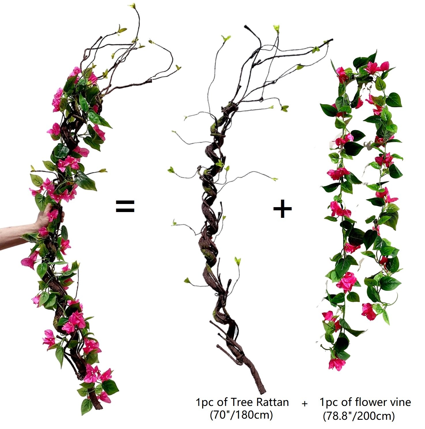 - Size and Package: 1pc of artificial tree rattan + 1pc of bougainvillea flower vine is seperated and shipped with box. For the Tree rattan total length 5.9Ft/180cm, the diamater is about 1.6-2 inches. For the bougainvillea, the total length is 78.8″/200cm, including 51 silk flowers + 51 plastic leaves. You need to twist the flower vine on the rattan as you want.